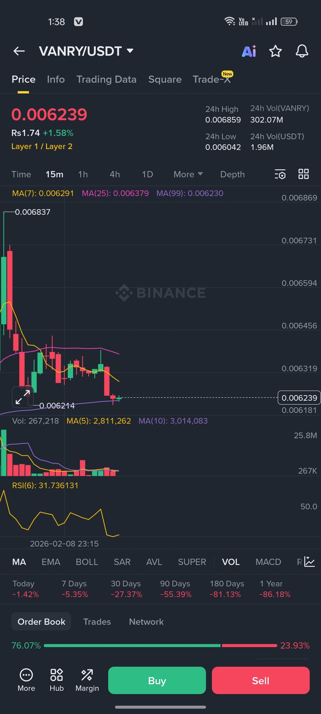 The VANRY/USDT pair on Binance is currently priced at 0.006239 USDT, up 1.58% in the last 24 hours. The token hit a 24‑hour high of 0.006859 and a low of 0.006042, showing moderate volatility.
