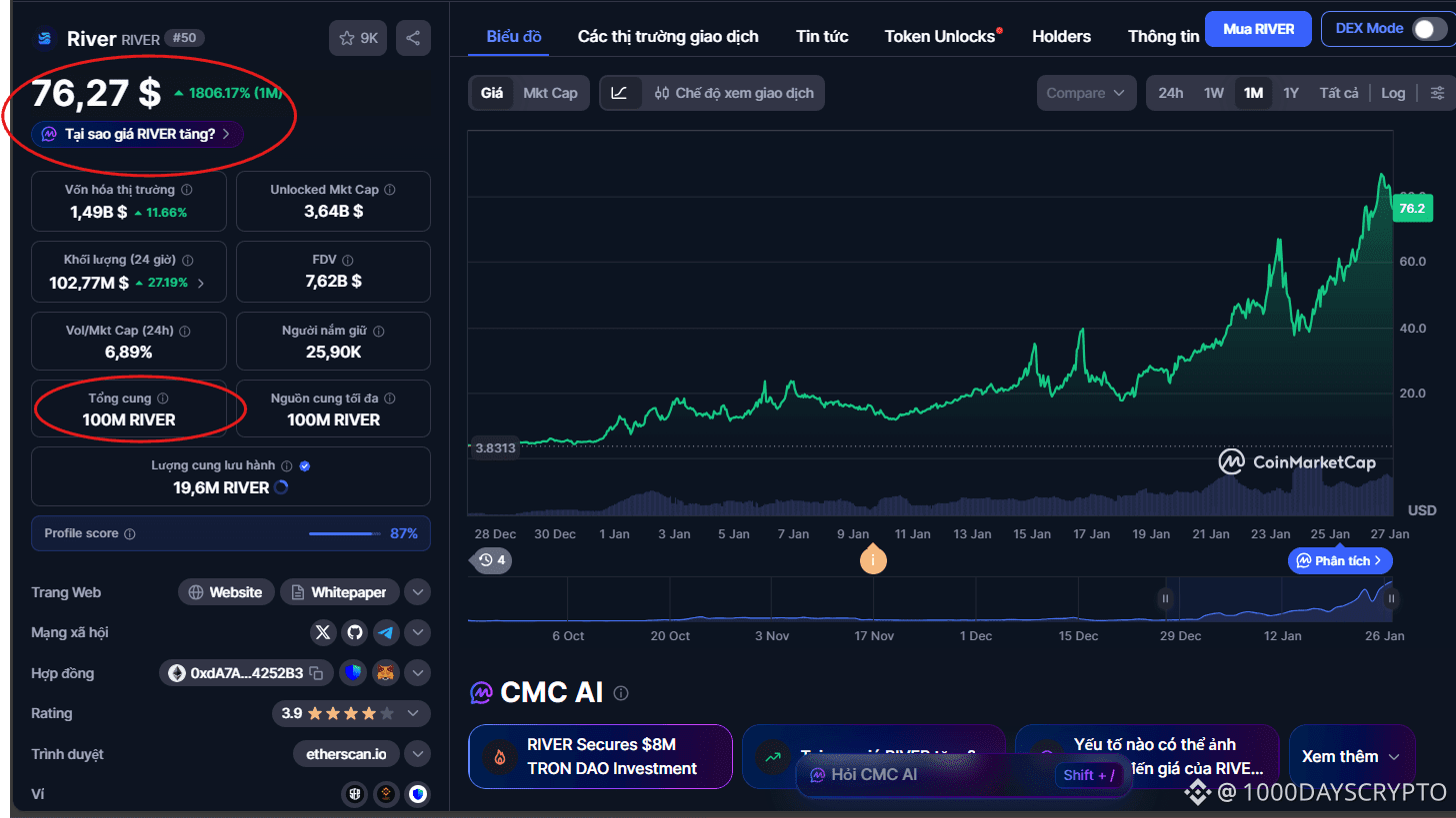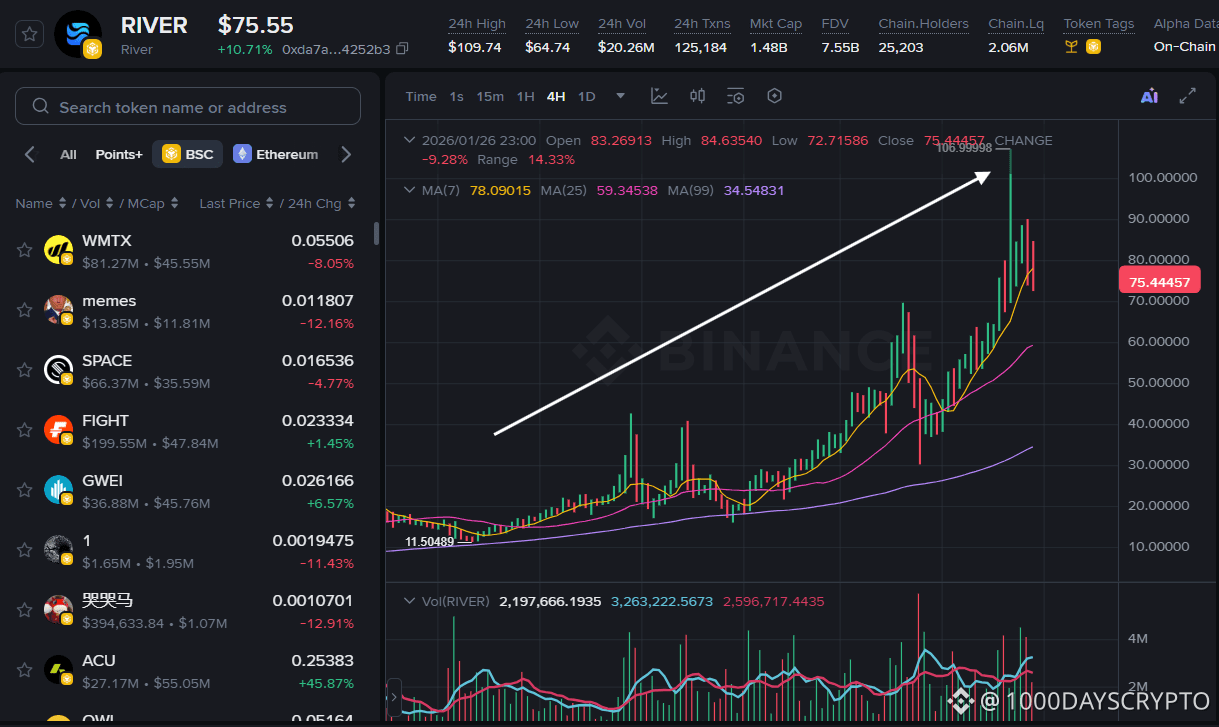 When $RIVER launched, it looked like just another “promising” token in a market full of promises. Low price. Modest volume. A narrative that sounded technical, even boring. Fast forward a few months—and RIVER is up over 155% in a single week, trading around $84, with a $1.6B market cap.