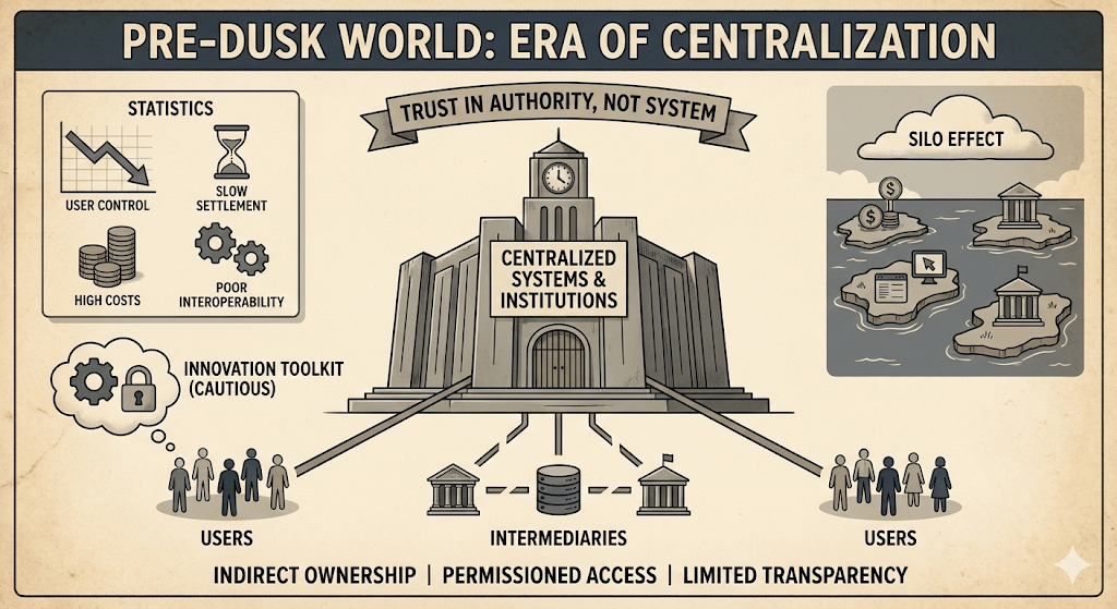 The pre-Dusk world represented a different model for constructing systems, criteria for making decisions, and establishing trust. During this phase of development, most systems were centralized and controlled by only a few groups. The majority of the systems created provided convenience over fairness to users. In finance, technology, and governance, end users relied heavily on intermediaries (ex: banks held assets, platforms stored data, institutions defined rules/regulations). Therefore, end users had limited access to both visibility and control over processes, which were typically sluggish & fragmented in nature.