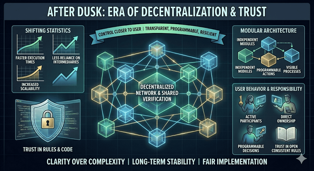 After Dusk indicates an explicit shift in the design of systems and how they treat trust. The control of the system has moved closer to the user. Systems are built to be transparent, programmable, and resilient. Instead of trusting one source of authority, there is a distribution of trust across rules, code, and shared verification. The architecture becomes modular. The network replaces the monolith. Each piece functions independently, but all pieces still work together as part of a larger whole.