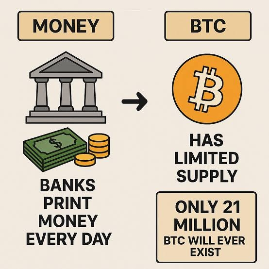 The US dollar can be printed anytime, reducing its value over time.Bitcoin has a fixed supply of 21 million, making it scarce.USD looks stable but slowly loses purchasing power.BTC is volatile short-term but strong long-term.Dollar is for spending, Bitcoin is for saving.