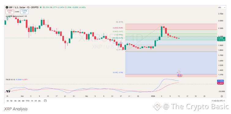 If XRP fails to reclaim the $2.09–$2.17 zone, downside pressure could return, with first support at the 0.618 level, followed by deeper support at the 0.786 retracement near $1.91. A loss of that level would expose the lower demand area around $1.77, which marks the base of the broader Fibonacci structure.