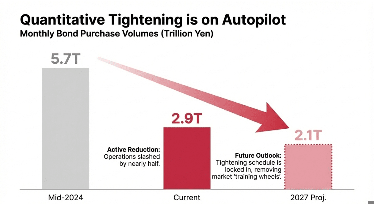 • Aggressive Cuts: Monthly JGB purchases have dropped from 5.7 trillion Yen in mid-2024 to just 2.9 trillion Yen currently.