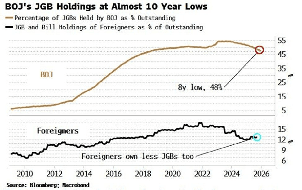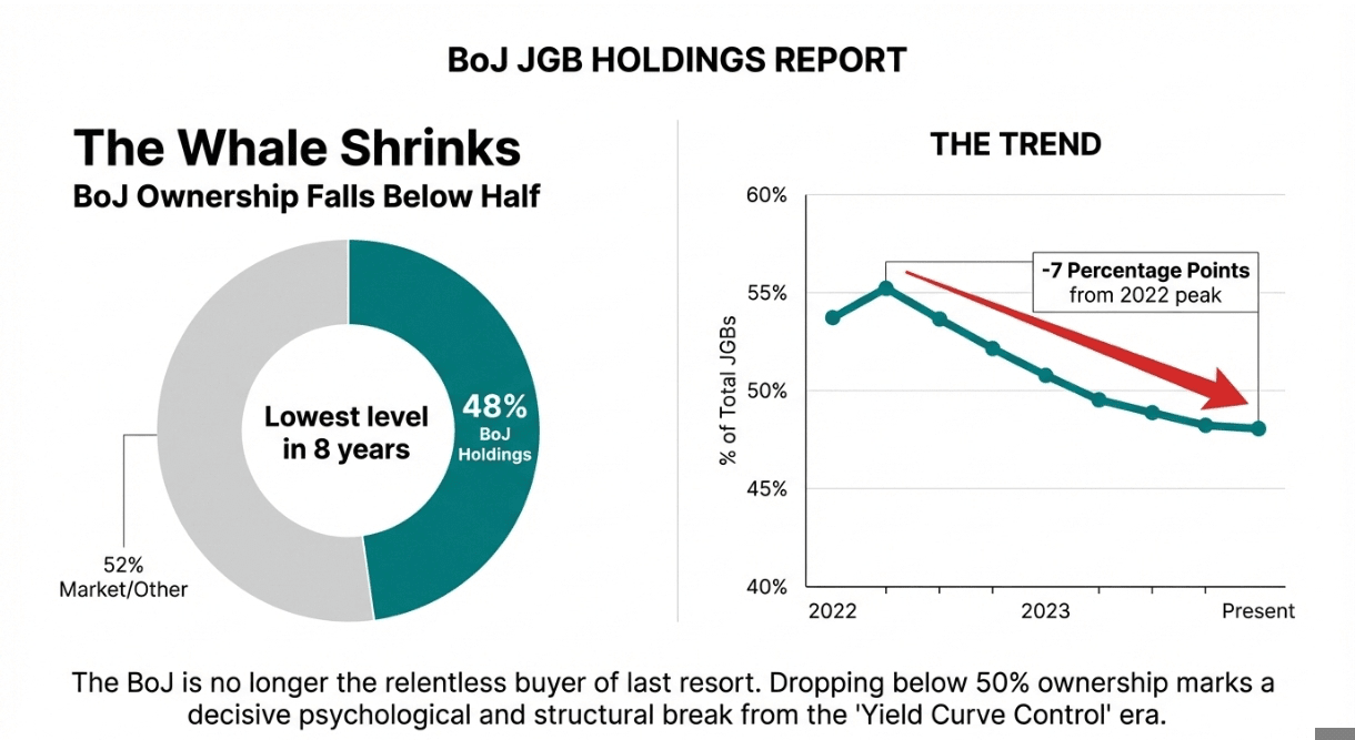 • 48% Ownership: The central bank now holds less than half of the JGB market, a psychological and structural shift from the dominance of the last decade.
