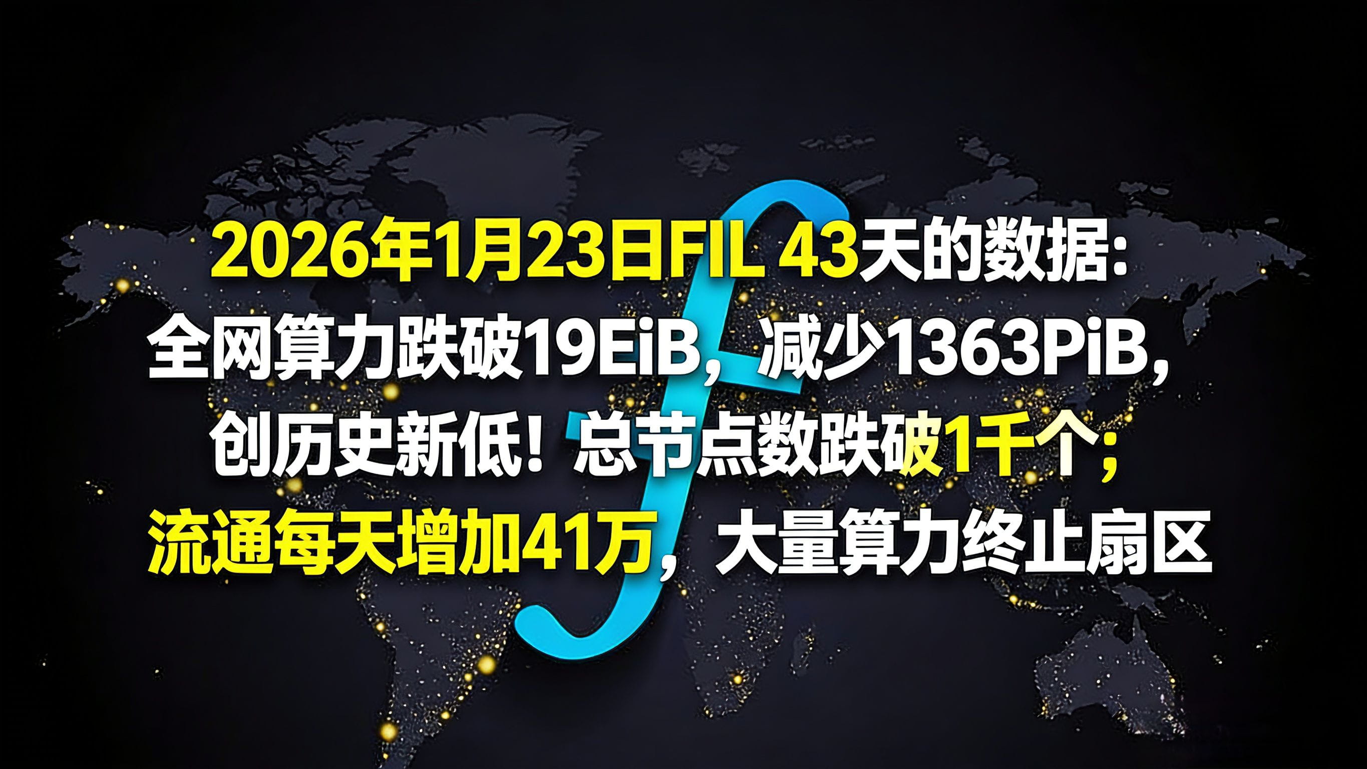 2026年1月23日FIL 43天的数据:Filecoin 全网算力跌破19EiB,减少1363PiB,创历史新低!总节点数跌破1千个;流通每天增加41万,大量算力提前终止扇区解除质押,超1千万FIL流向市场,造成抛压!