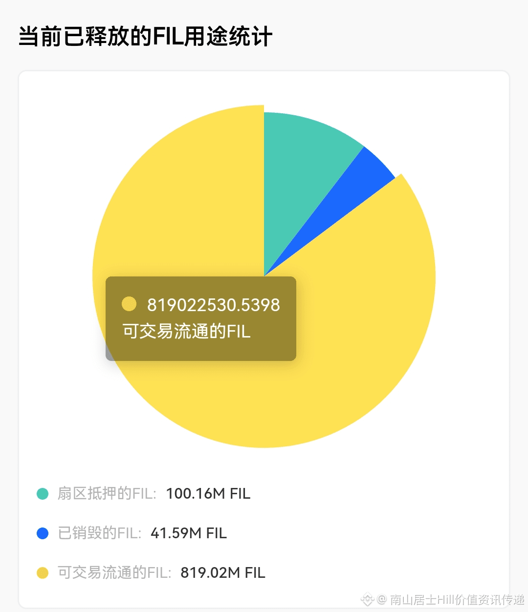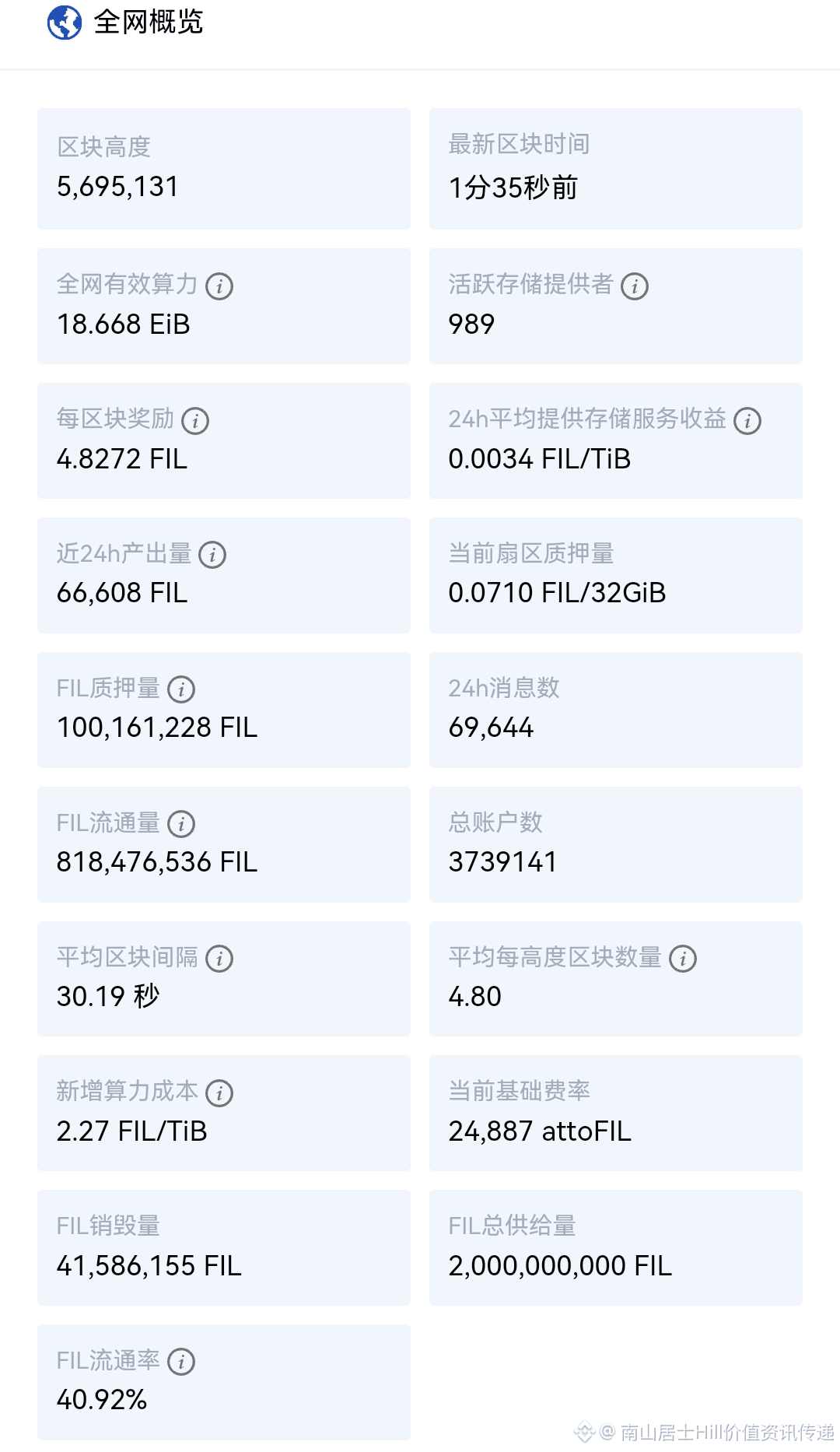 流通量(通胀)43天增加了17485478FIL(平均每天增加41万FIL;其中区块奖励是66608FIL,目前流通总量最多为:818476536FIL,时间在2026年1月23日);