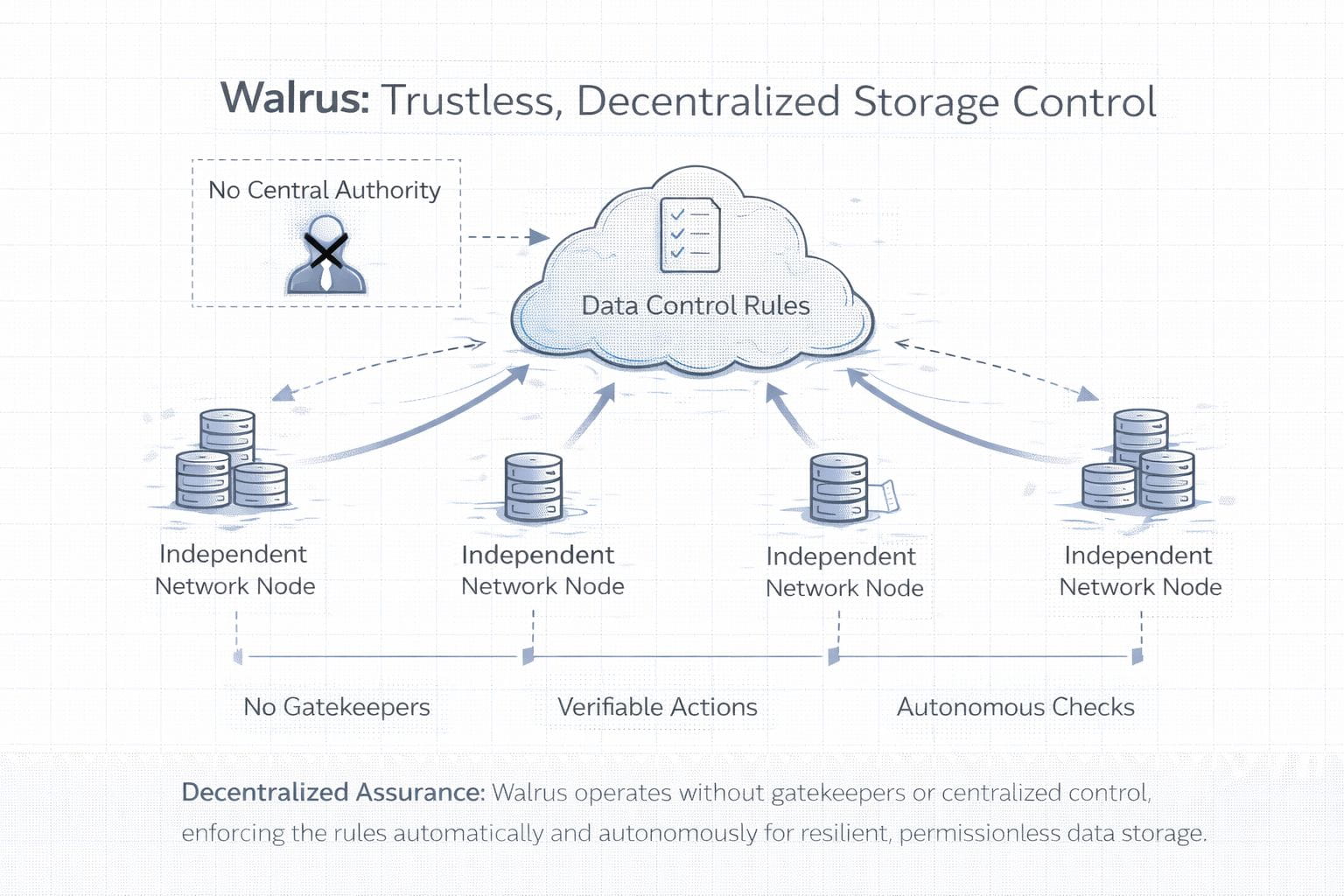 In Walrus, there is no single team or server “in charge” of your data. And that is the point. Storage is run by the network itself, through simple rules that everyone can verify. Data is split into pieces, spread across many independent helpers, and checked often to make sure it is still complete and correct. If some parts disappear or some machines go offline, the system rebuilds what is missing from what remains.