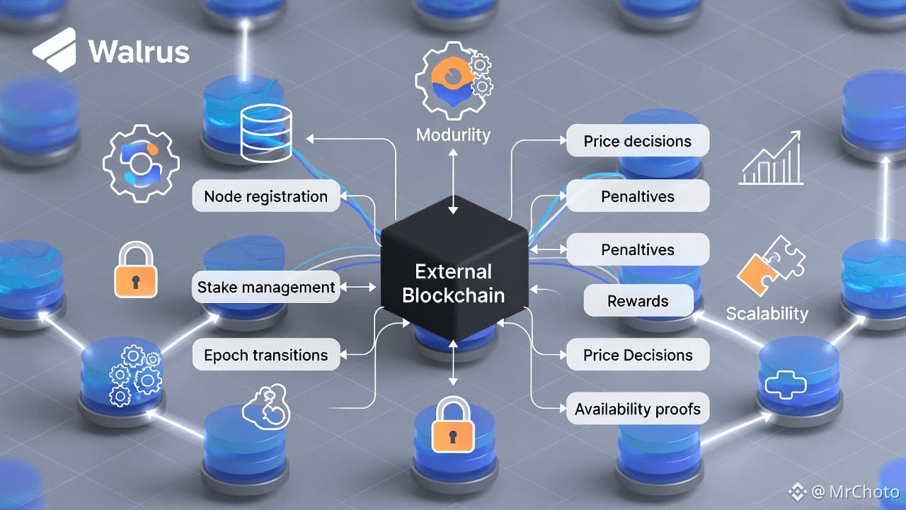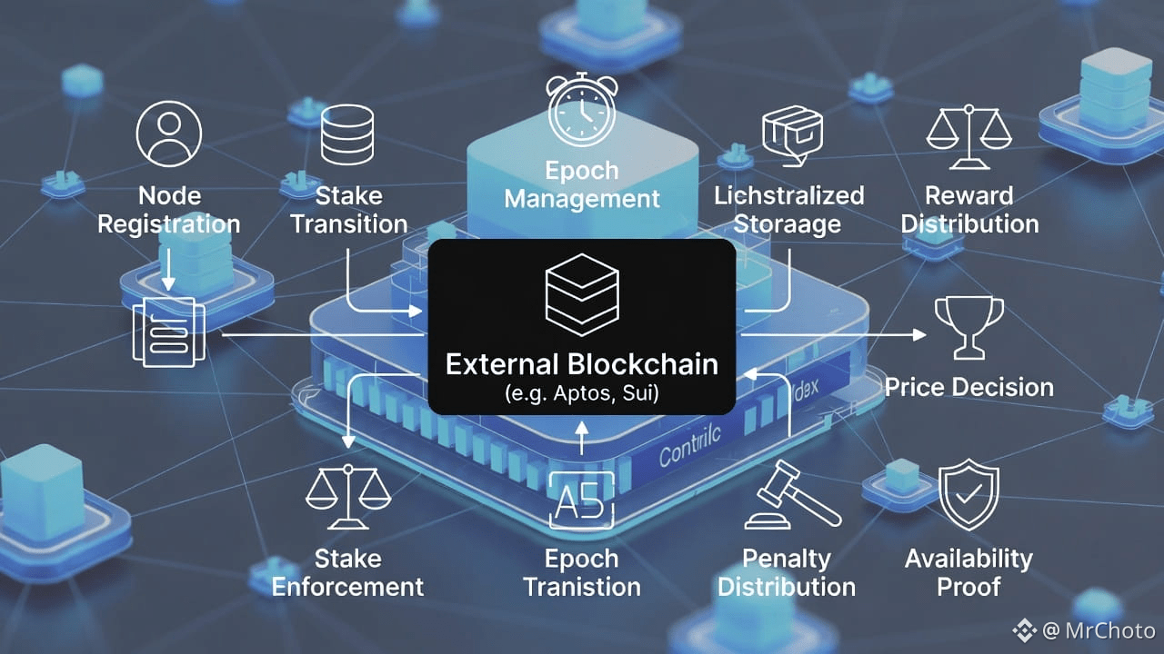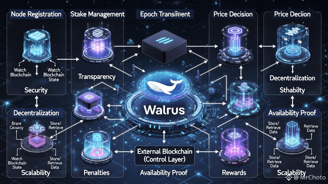 Control-plane operations in Walrus, including node registration, stake management, epoch transitions, price decisions, penalties, rewards, and availability proofs, are handled by the external blockchain. These rules are not arbitrarily agreed upon by storage nodes. Rather, they rely on the consensus of the blockchain to provide a completely ordered, globally accepted series of choices. Walrus views the blockchain as a deterministic machine, submitting transactions as inputs and relying on the blockchain to provide a final, consistent state update.