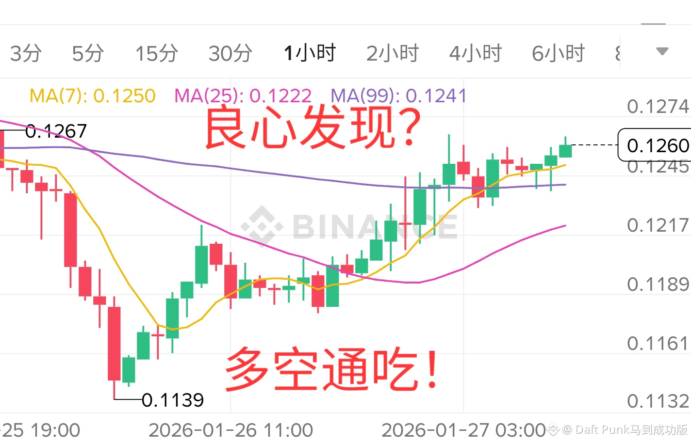 仔细看这张图。价格触及0.1139之后,没有继续崩盘,反而走出了一个漂亮的V型反转。现在0.1260的价格已经稳稳站在MA99上方(图中那条紫线)。