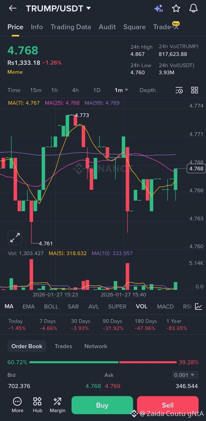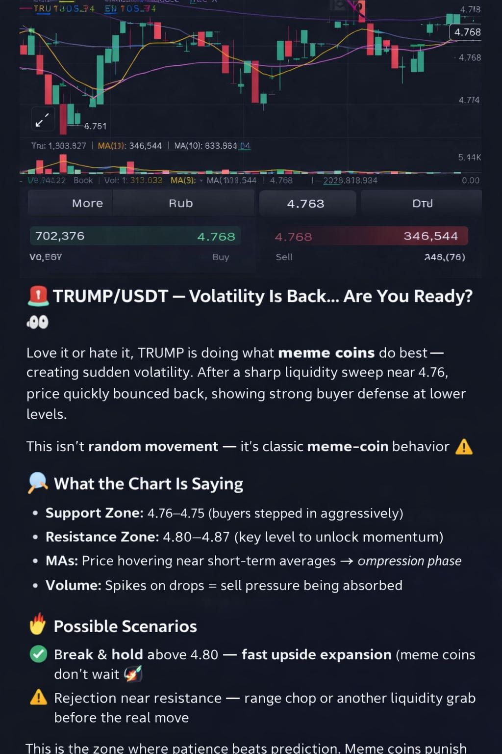 Love it or hate it, TRUMP is doing what meme coins do best โ creating sudden volatility. After a sharp liquidity sweep near 4.76, price quickly bounced back, showing strong buyer defense at lower levels.