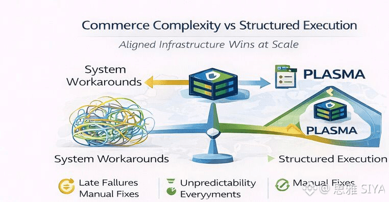 The difference becomes more obvious as volume grows. Moving money scales linearly. Running commerce scales exponentially in complexity. Systems that ignore this reality eventually collapse under their own workarounds. Plasma avoids this by designing for continuity from the start.
