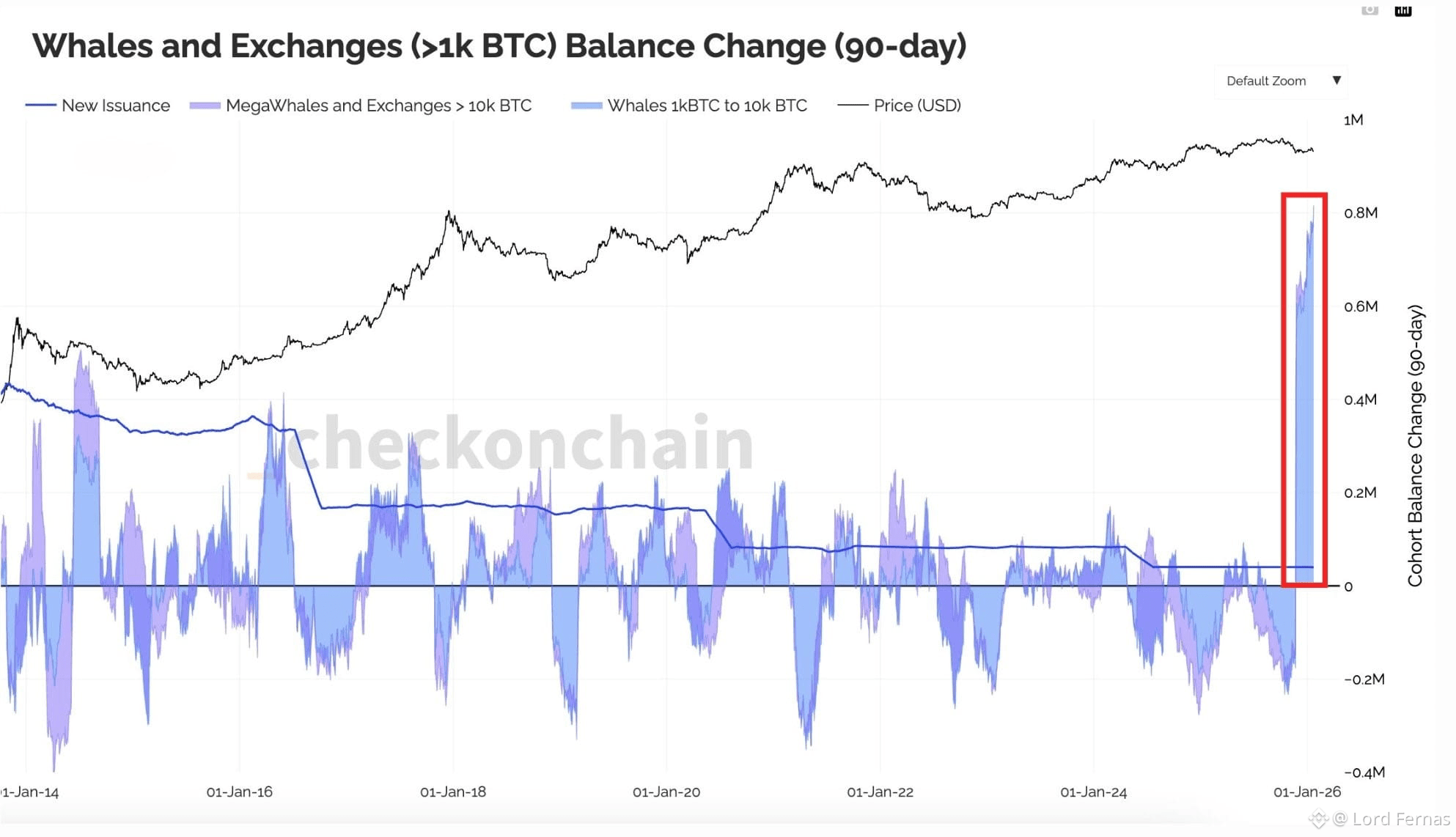 Esta mudança de saldo de 90 dias mostra um aumento acentuado na acumulação de carteiras com mais de 1k $BTC , com mega baleias e exchanges absorvendo a oferta agressivamente enquanto o preço permanece elevado.