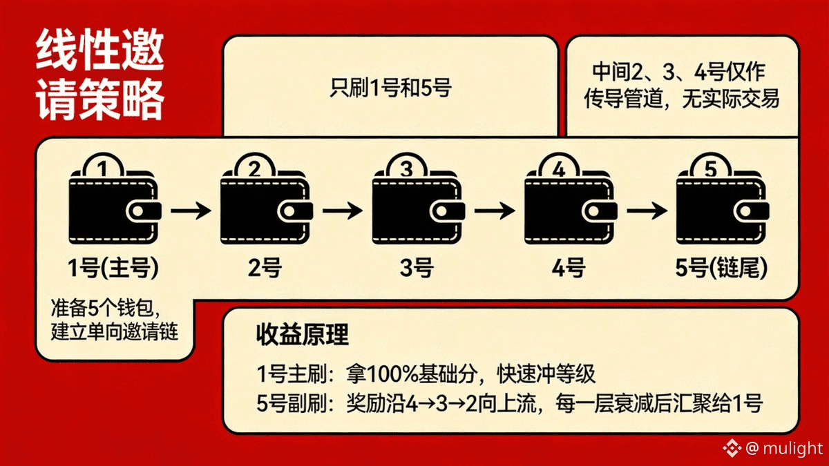 准备 5 个钱包,建立单向邀请链: 1号(主号) ➔ 2号 ➔ 3号 ➔ 4号 ➔ 5号(链尾)