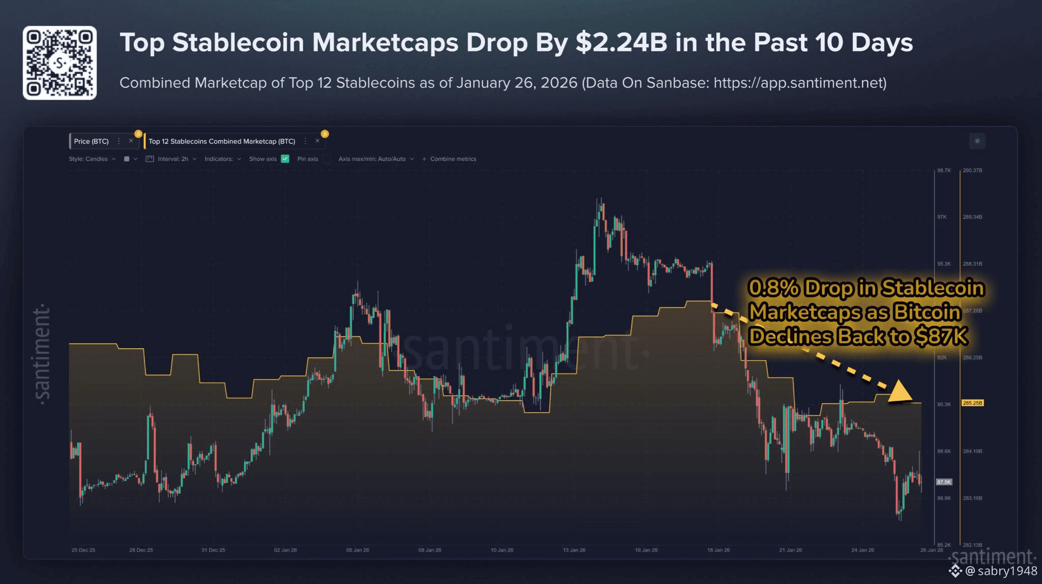 تشير بيانات "سانتيمنت" إلى أن انخفاض القيمة السوقية الإجمالية للعملات المستقرة بمقدار 2.24 مليار دولار خلال عشرة أيام ليس مجرد تصحيح طبيعي، بل إشارة على أن المستثمرين يسحبون أموالهم من النظام البيئي للعملات المشفرة تمامًا ويحولونها إلى: