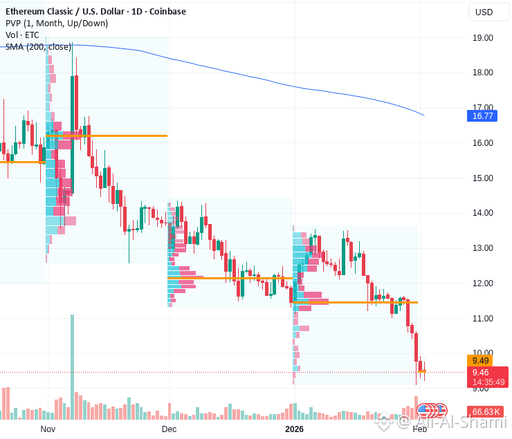 يمكنك رؤية ذلك في حركة السعر. انخفضت ETC نحو منطقة 9.75 دولار بعد فشلها في الحفاظ على مستويات أعلى في وقت سابق من يناير. تظهر الجلسات الأخيرة قممًا منخفضة ومحاولات ارتداد تتلاشى، مما يدل على أن البائعين لا يزالون في السيطرة. لم تنقلب الزخم بعد، وقد تم بيع كل ارتفاع صغير بسرعة.
