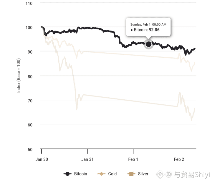 By Monday, when commodities reopened, the price movements of Bitcoin, gold, and silver had converged. This convergence, rather than divergent declines, suggests alignment with shared macro conditions.
