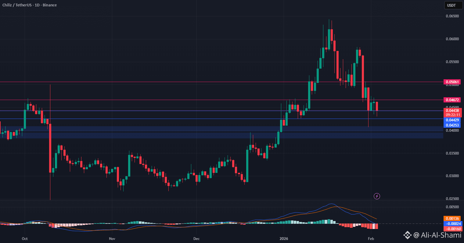 🔸 $0.04672 – المقاومة من منطقة توزيع 30 يناير عند متوسط الحركة لمدة 40 يومًا، متداخلاً مع الفراغ الأسبوعي الصاعد الذي لم يعد صالحًا في 5 يناير.