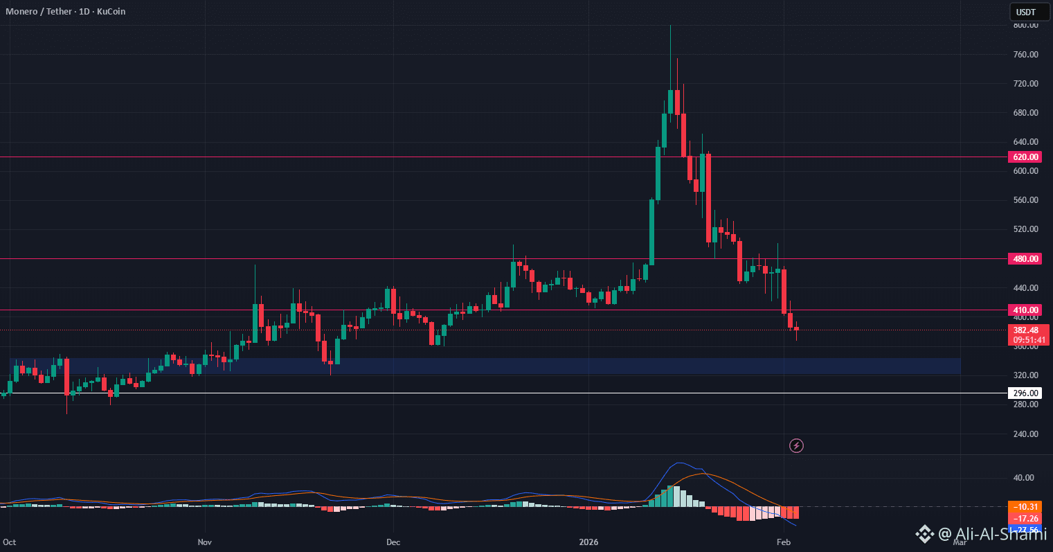 XMR حالياً ~50% أدنى من ATH الخاص به، مع عدم قدرة حركة السعر الأخيرة على الثبات فوق المقاومة الحرجة $410. هذا الانكسار قد فتح الباب لمزيد من الانخفاض، مع تحول منطقة الدعم الرئيسية التالية إلى منطقة رئيسية للمراقبة. إذا تحسنت المشاعر، يمكن أن تعمل هذه المنطقة كقاعدة انعكاس.
