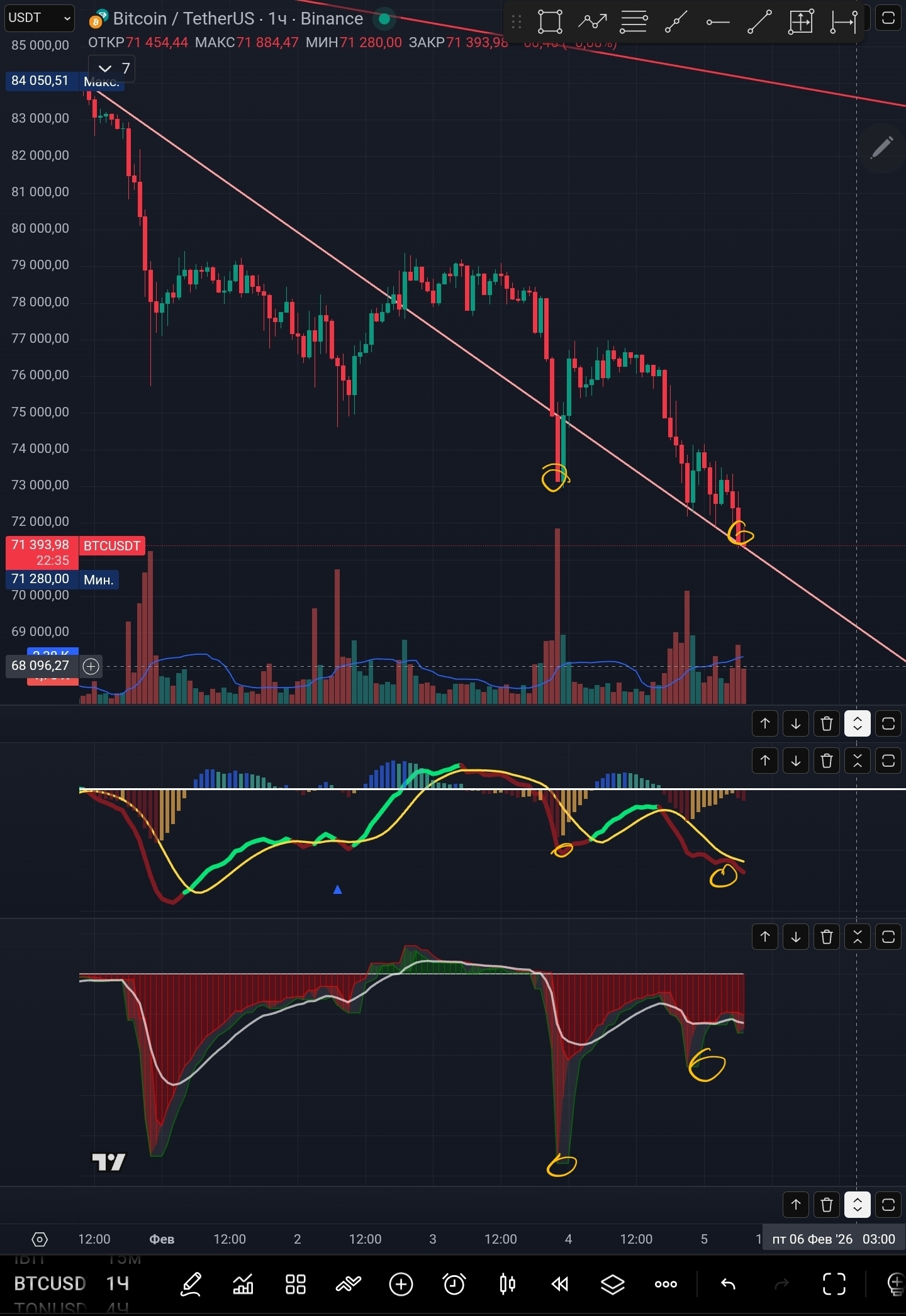 📍Вывод для себя я делаю следующий: Я такой же человек как и вы, и я также опасаюсь за свои деньги, Это нормальное чувство которое невозможно не испытывать в нашем деле. Главное здесь иметь чёткую стратегию, которая бы давала нам чёткий план : бычья дивергенция есть - значит мы наращиваем позиции и скоро идём вверх. Бычья дивергенция сломалась - выходим из сделки и фиксируем убыток, чтобы он не перерос в большую потерю. Скажу вам, что слом бычьей дивергенции я ещё пока не встречал, всегда был хороший рост после её формирования (иногда с запазданием, но всегда был). Рост биткоина с ноября по конец января был без каких-либо сигналов от индикаторов, именно поэтому я говорил, что мы свалимся дальше вниз. Сейчас же сигнал есть. Он есть на 15 минутах, он есть на часовых свечах, он практически сформировался на четырёх часах, и формируется на дневных графиках. Отключаем эмоции, нашими сделками должна двигать только Булева алгебра Да/Нет.