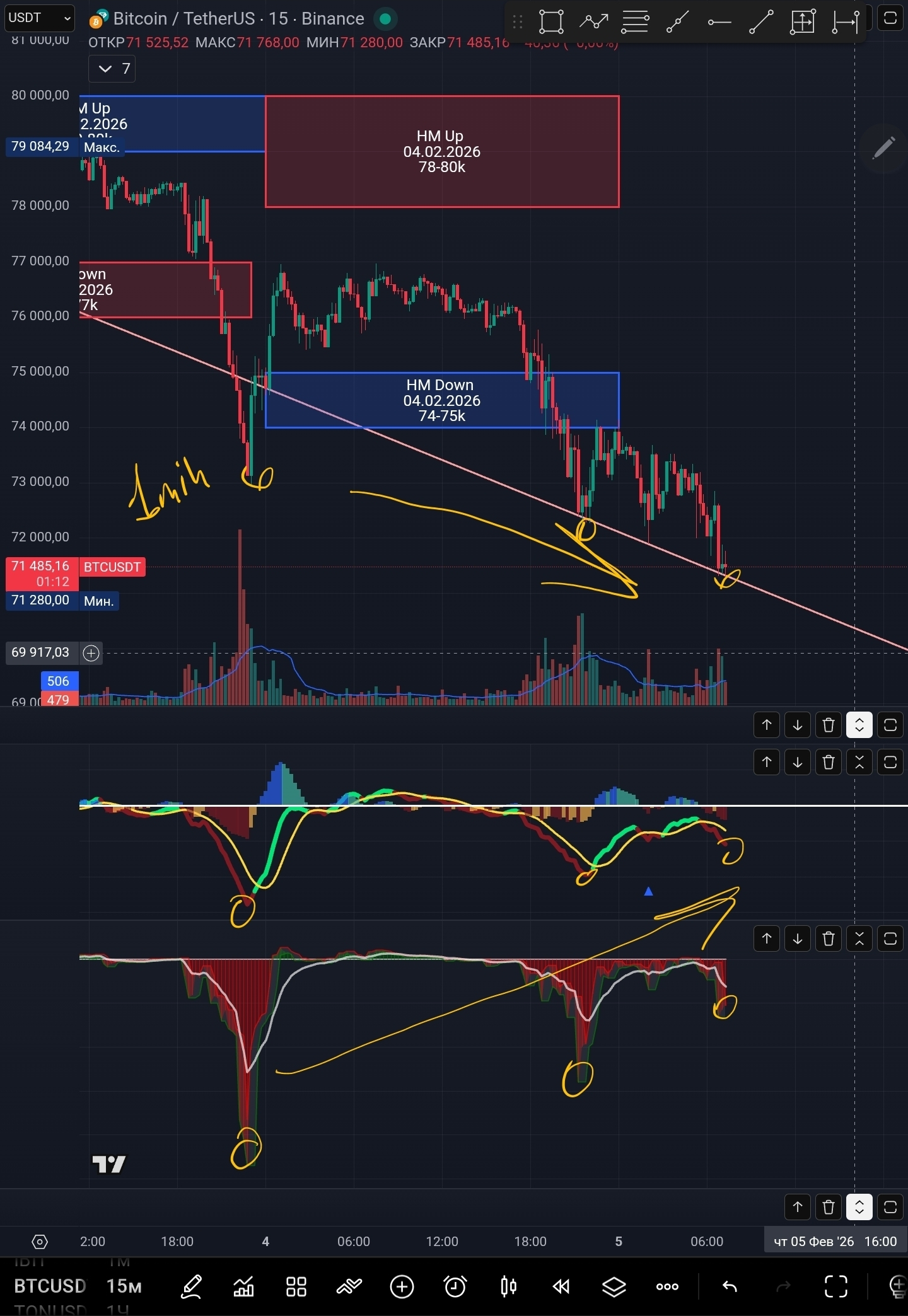 Доброе утро дорогие друзья! Цена медленно скатывается вниз волнами, с развитием бычьей дивергенции. На 15 минутах видно как это происходит
