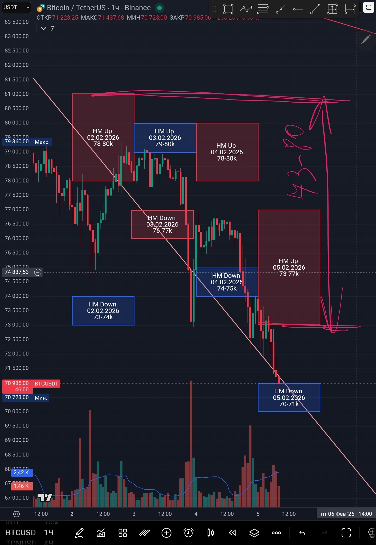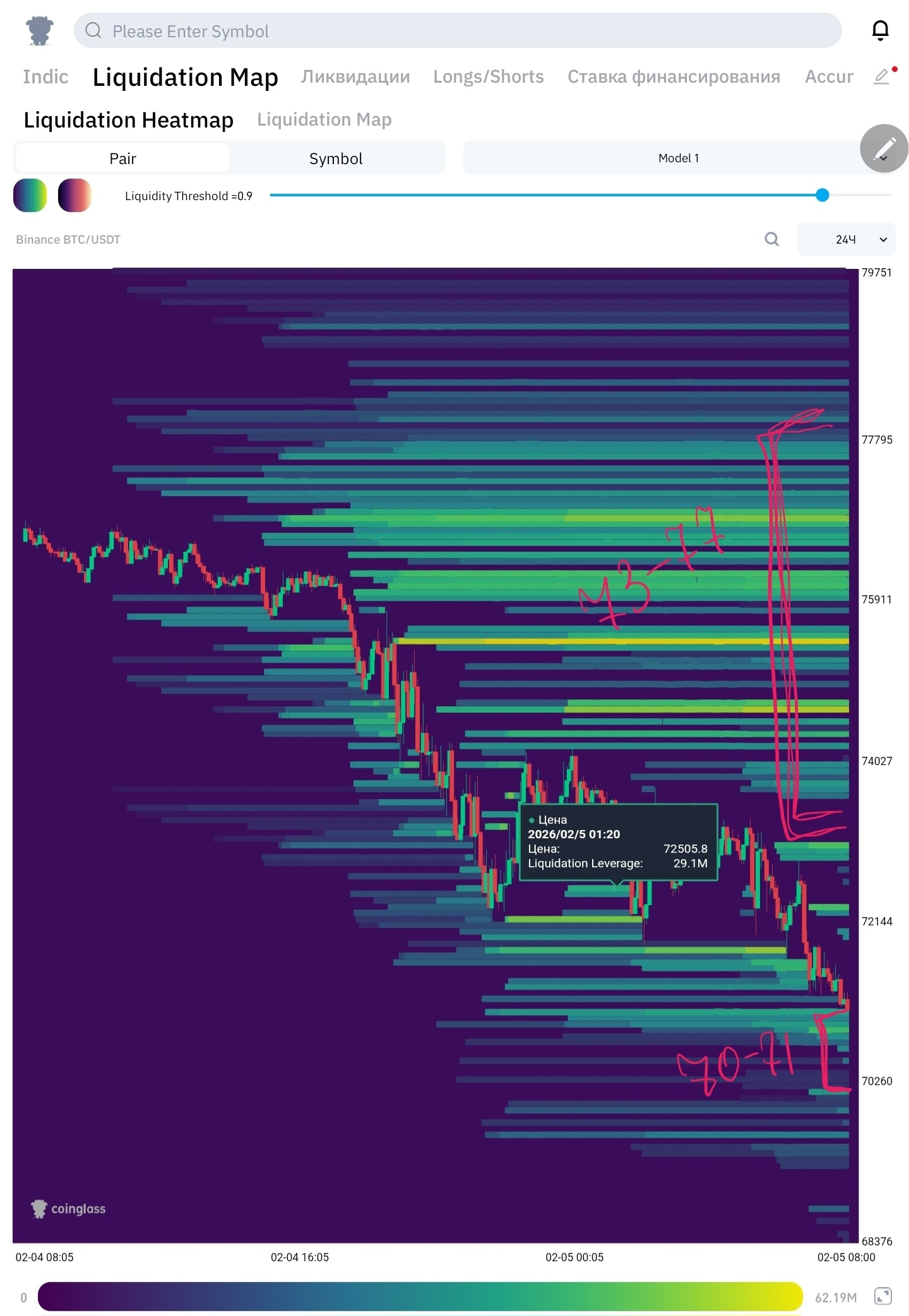 📍 Тепловая карта нам даёт горячий уровень 73-77k и холодный уровень 70-71k