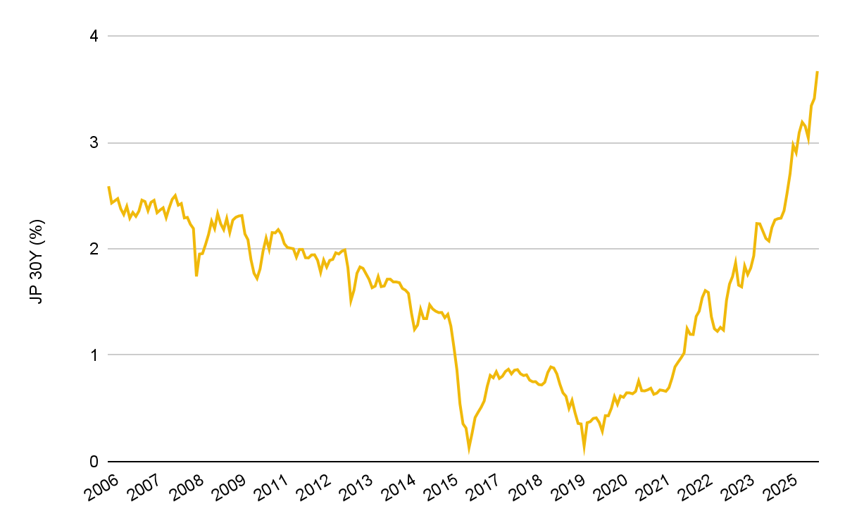 Japan's government bond (JGB) market triggered a significant global repricing of risk this week. A pronounced sell-off in Japanese long-duration bonds has pushed global borrowing costs higher, driven by evolving inflation expectations and ongoing fiscal concerns. Worries about potential expansive policy have added pressure to the country’s government debt, which already exceeds 250% of its GDP, one of the highest ratios in the world. Market volatility spiked as JP10Y rose sharply in a short period, while the JP30Y registered one of its largest daily increases since 2003, peaking at a new high of approximately 3.9%.