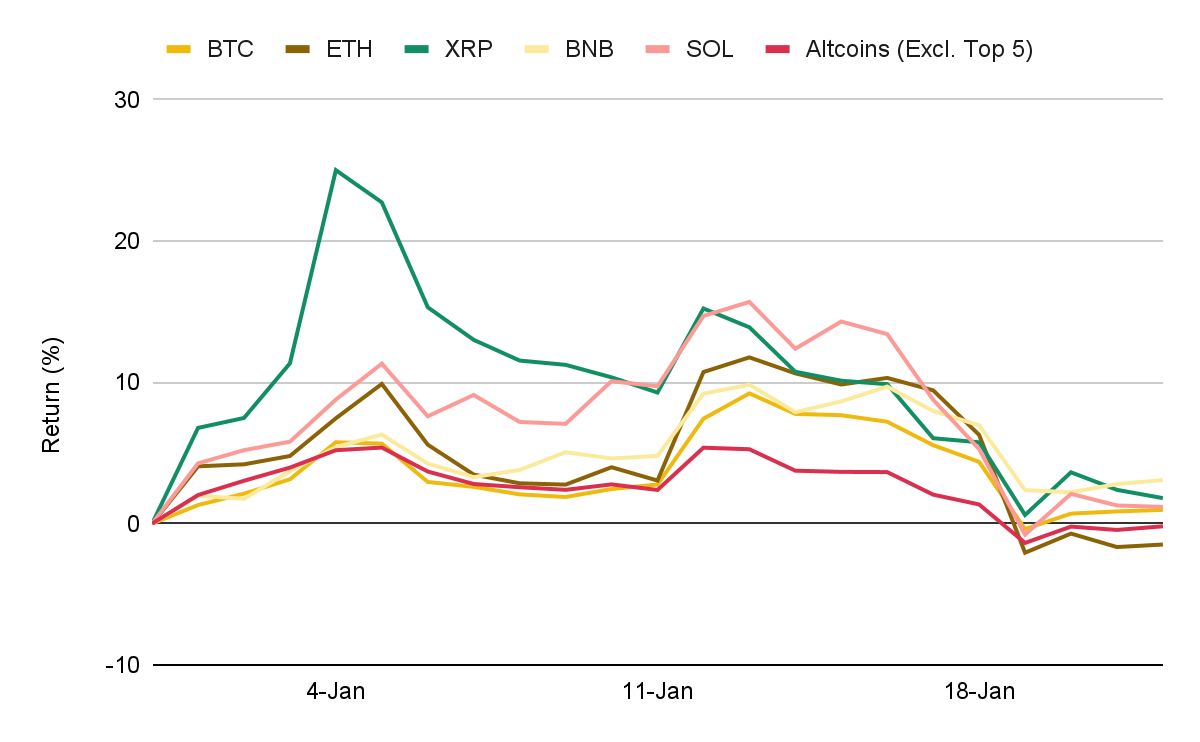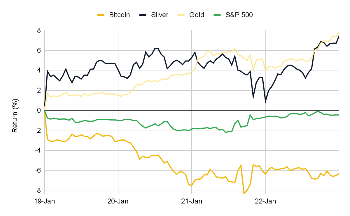 Markets were hit by geopolitical shocks this week, driven by developments around Greenland and a renewed trade-war narrative. Both BTC and equities briefly erased their YTD gains before rebounding after President Donald Trump softened his stance on tariffs, signaling that eight European countries would not move forward.