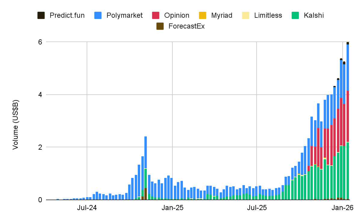 • After rising more than nine-fold in 2025, prediction markets crossed a new milestone this week, with weekly notional volumes exceeding US$6B for the first time, as activity continues to broaden beyond single-event markets.