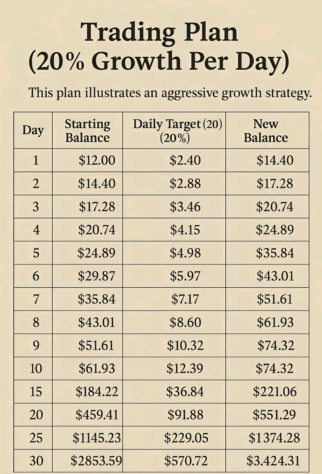➡️ Za pouhých 30 dní může $12 vyrůst na $3,424.31, pokud se budete držet cíle 20% denně.
