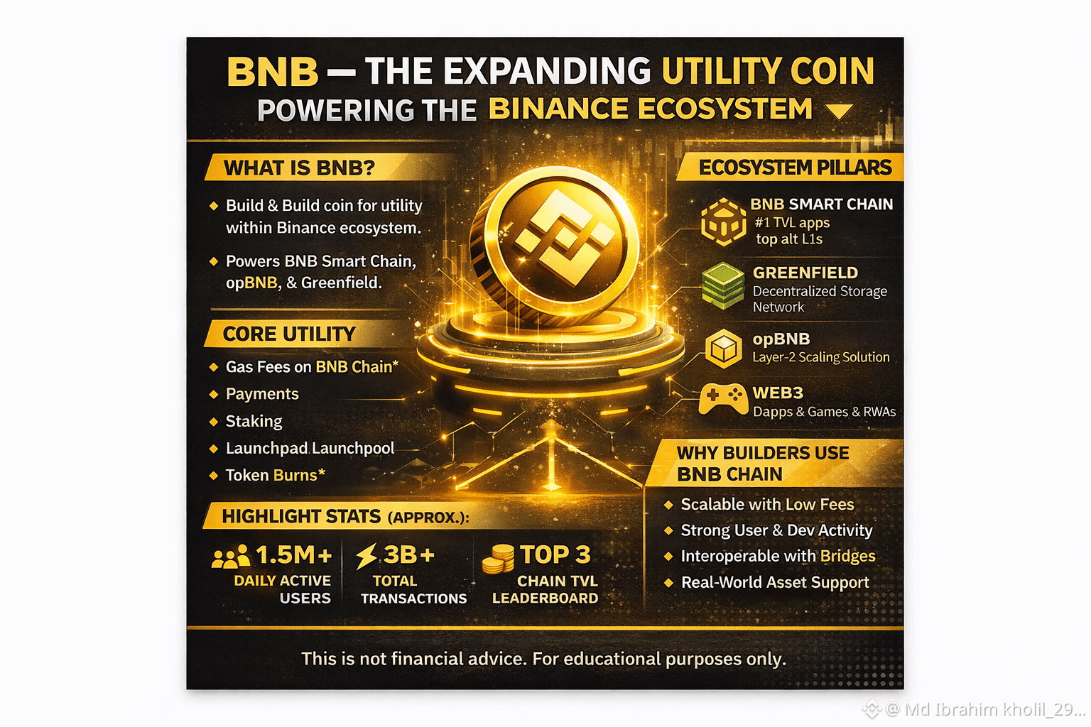 Today, BNB powers the BNB Chain, a scalable network designed for decentralized applications, DeFi protocols, metaverse products, and real-world asset tokenization. Developers choose BNB Chain mainly for low fees, fast settlement, and strong infrastructure support.