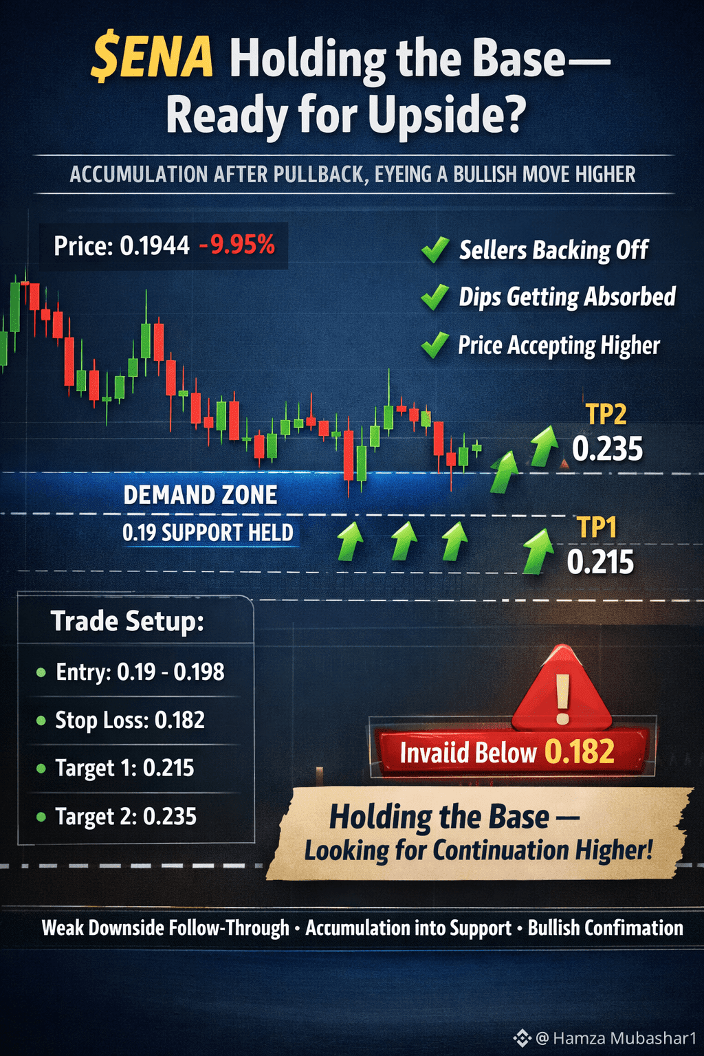 $ENA ne recent pullback ke baad 0.19 ke qareeb strong base form kiya hai. Is zone par sellers ka pressure clearly kam hota dikh raha hai, jabke har dip ko buyers aggressively absorb kar rahe hain. Yeh indicate karta hai ke price lower levels accept nahi kar rahi, jo ek bullish sign hai.