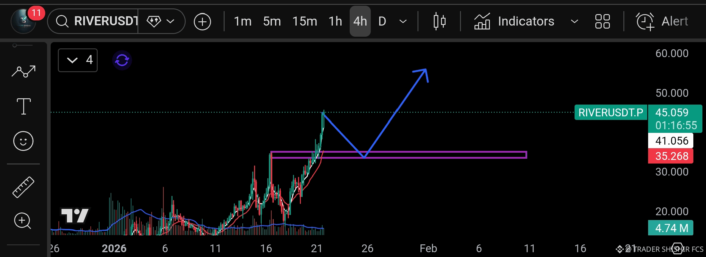 On the 4h chart, $RIVER bounced hard from the purple support zone ($35–$41) – blue arrow pointing straight up for continuation! 🔥