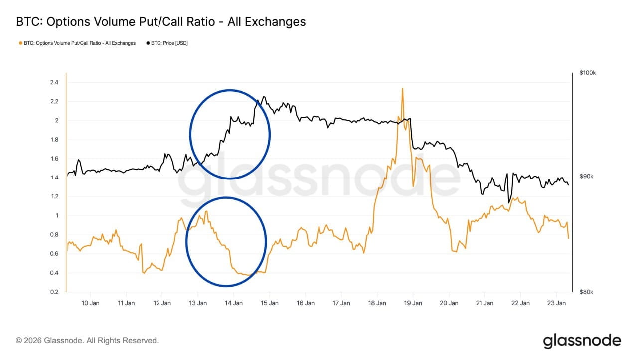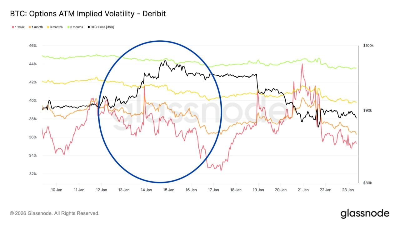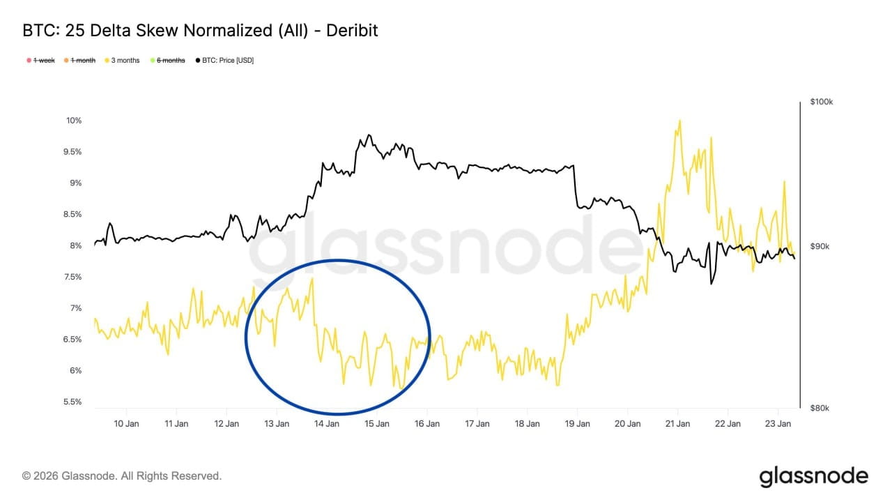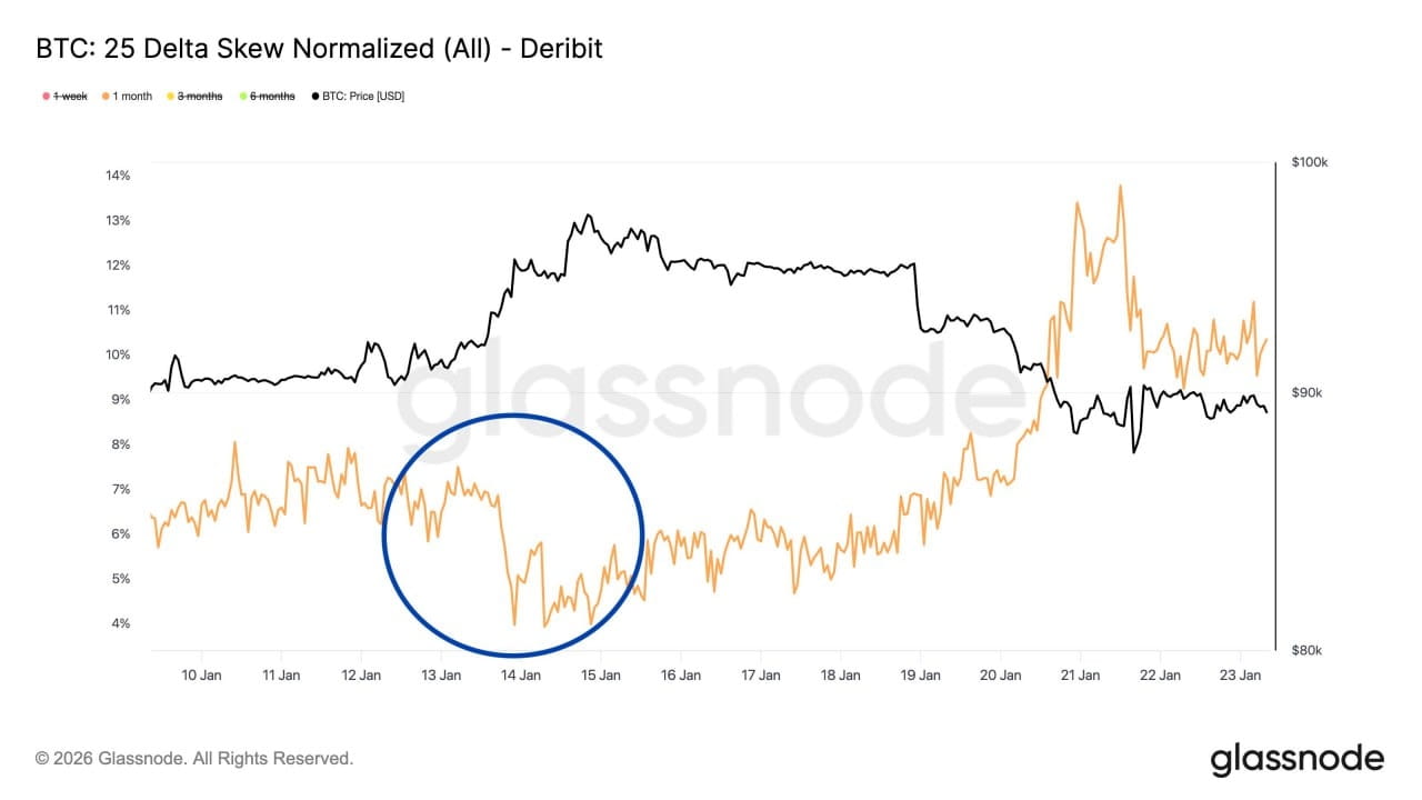 Analytici #Glassnode píší, že v polovině ledna BTC za pár dní přidal přibližně +8 %, a podle opcí to vypadalo jako rychlý obrat nálad. Krátkodobí obchodníci začali aktivně sázet na růst, ale u delších termínů zůstali účastníci trhu opatrní. To znamená, že v následujících dnech lidé kupovali "sázky na růst", i když na horizontu měsíce a čtvrtletí pojistka proti poklesu nikam nezmizela.