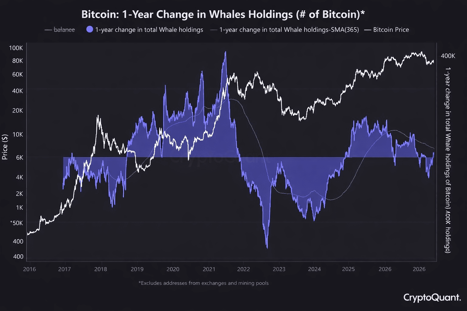 Objem držení Whale Holdings přestal klesat po téměř roce distribuce, což naznačuje, že velcí investoři již neprodávají silně, ale také se ještě nevrátili k agresivní akumulaci. Tento neutrální stav bývá obvykle poslední fází před tím, než směrové peníze získají jasnější směr.