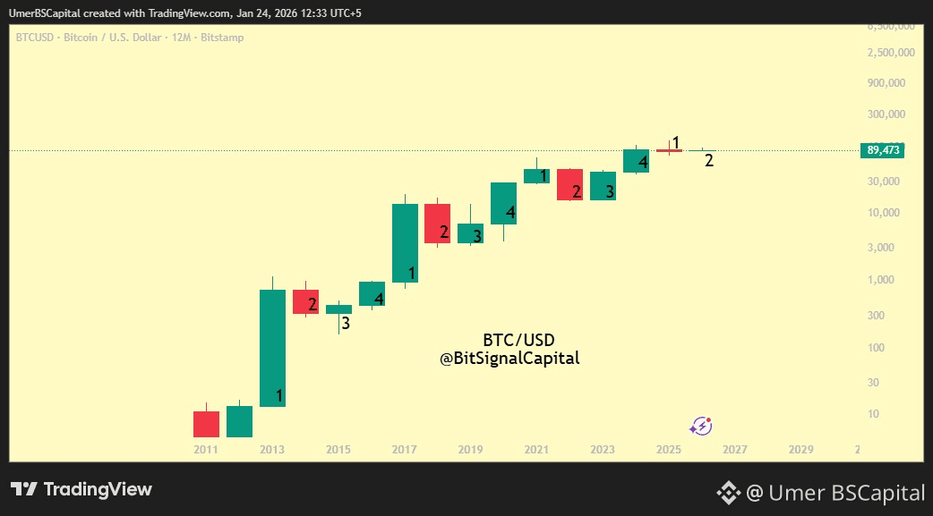 Looking at past cycles, 2025 statistically fits the role of a bull-market top, while 2026 has historically acted as the Bitcoin bear-market year. This does not always mean a sharp crash — more often, it reflects a prolonged period of lower highs, fading momentum, and capital rotation.