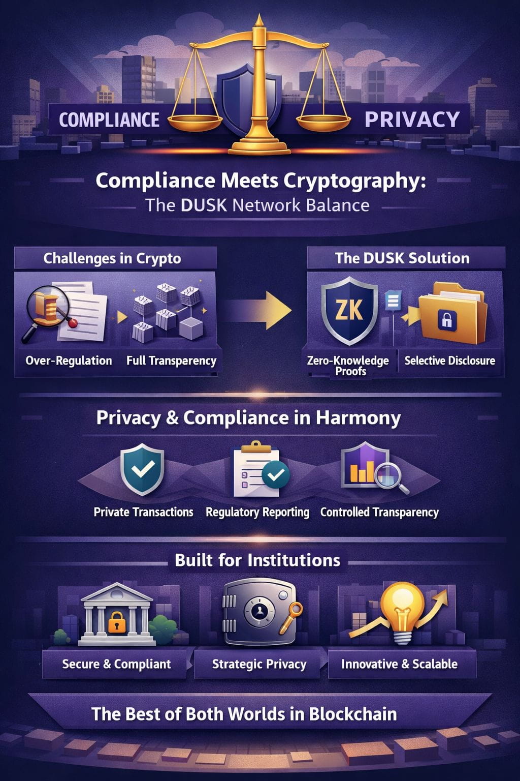 DUSK, through combining cryptographic privacy and the demands of regulations, demonstrates the following fundamental concept: Blockchain-based systems provide not just trust but privacy.