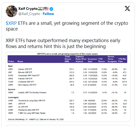 Příspěvek Xaif Crypto zdůraznil, že i když XRP ETF představují relativně úzký segment celkového trhu ETF s kryptoměnami, jejich rané čisté toky a výkonnostní metriky překonaly mnoho počátečních předpokladů.
