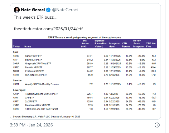$XRP Investor do kryptoměn a analytik Xaif Crypto zdůraznil raný výkon XRP fondů obchodovaných na burze, popisujíc je jako malý, ale rostoucí segment trhu s digitálními aktivy.