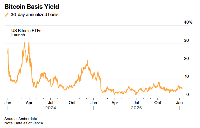 根据 Amberdata 汇总的数据,目前一个月期限的年化收益率徘徊在约 5% 左右,处于近年来的低位。Amberdata 衍生品主管 Greg Magadini 表示,就在一年前的这个时候,基差还接近 17%,而如今已降至约 4.7%,几乎只够勉强覆盖资金成本和执行成本的门槛。与此同时,一年期美债收益率约为 3.5%,使得这笔交易的吸引力正在迅速消退。
