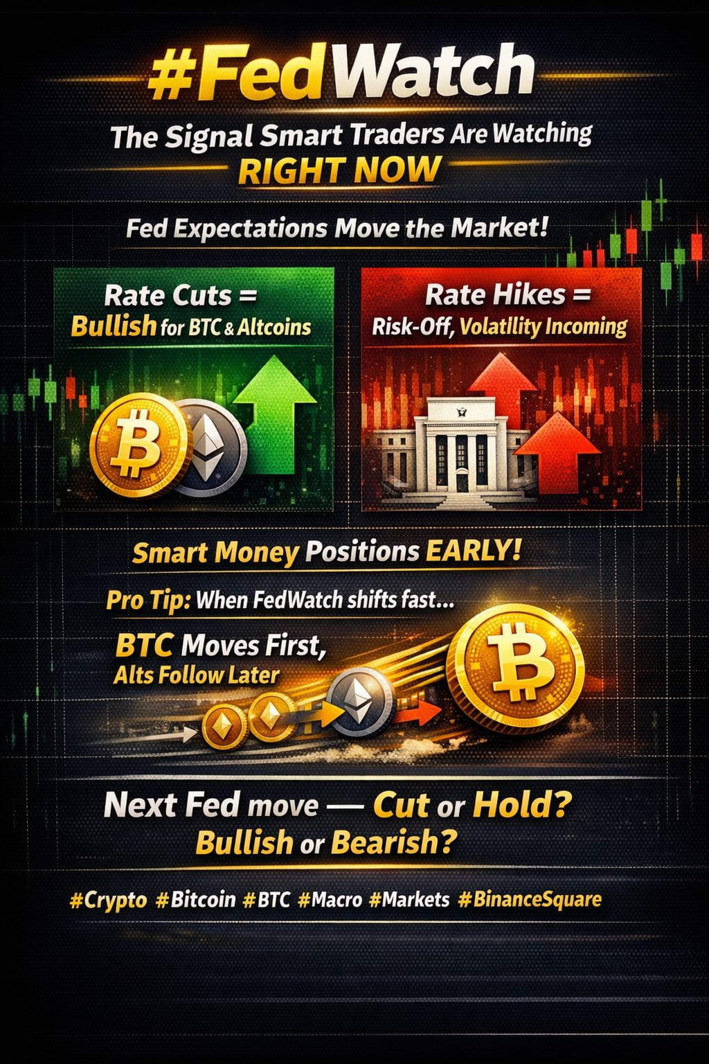 When FedWatch odds shift suddenly, BTC moves first, alts follow later.