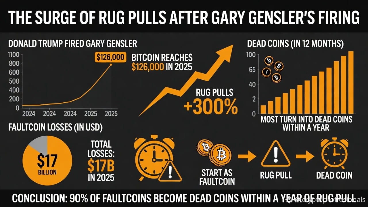 The result? A dramatic loosening of regulatory reins that critics say flung open the doors for scammers. In the year following Gensler's departure, faultcoins—low-utility or hype-driven altcoins—experienced an unprecedented wave of rug pulls, where developers hyped projects, attracted investments, and abruptly abandoned them, draining liquidity and leaving tokens worthless. Enforcement actions dropped sharply: The SEC pursued just 13 crypto cases in 2025, down 60% from 33 the prior year. This lax environment allowed faultcoins to proliferate unchecked, with many launching amid the post-inauguration hype only to rug within months. Like $FLOW