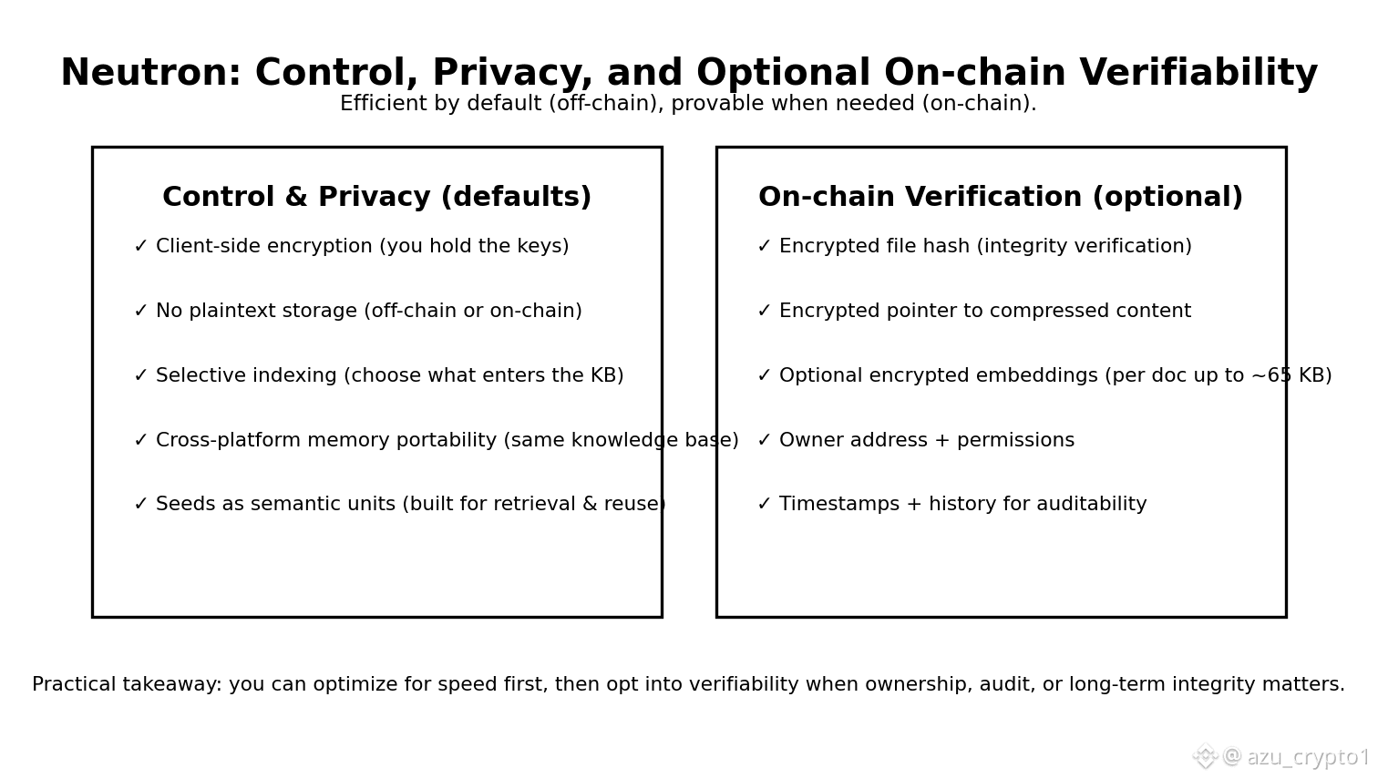 再往下看,技术可信度来自细节。文档里解释了当 Seed 选择上链时,Neutron 使用专门的文档存储合约,合约里会包含:加密后的文件哈希用于完整性验证、指向压缩文件的加密指针、并且还能把 embeddings 以加密方式存到链上(每份文档最高 65KB),同时记录 owner 地址、权限设置、时间戳与历史。 你看,这就把“可验证”落到了具体字段:验证靠哈希,权限靠地址,追溯靠时间戳和历史,而不是靠一句“我们很安全”。