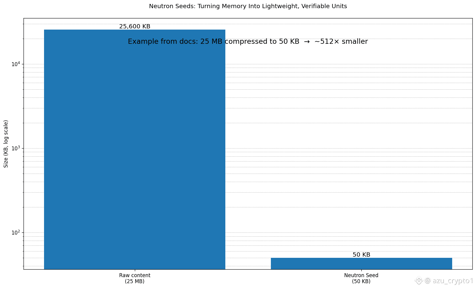 但 myNeutron 的意义还不止“把资料集中起来”。真正硬核的是它背后那层 Neutron:Vanar 把 Neutron 写成一种“AI 原生内存层”,核心动作不是存文件,而是把数据重构成可编程的 Seeds。官方页面直接给了一个非常能打的数字:25MB 压到 50KB,用语义、启发式与算法层的压缩,把原始内容变成超轻量、可加密验证的 Neutron Seeds。 这个数字在文章里特别好用,因为它把“记忆层不是口号”讲成了一次可感知的工程成果:不是挂一个 IPFS 链接,而是把内容变成能被检索、能被引用、能被智能体消费的语义单元。