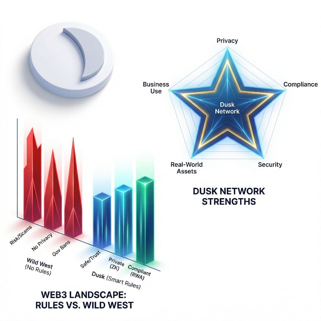 think different. They say "why choose privacy OR rules? We can have both!" Dusk Network is special Layer-1 blockchain. It build for regulated finance. Means it make for big institutions, businesses, but also for normal people like us. They use zero-knowledge proofs – fancy name but simple idea: you prove something true without show details. Like exam invigilator check you no cheat but no see your full answer paper. Cool na?With this, in Dusk, transactions private. No one see your balance or what you trade. But if regulator ask, system can show proof that all follow law – without leak secret. This call zero-knowledge compliance. Perfect for real-world assets (RWA). Like tokenizing shares, bonds, property. In old way, paper work slow, costly, middleman eat money. On Dusk, smart contracts do all fast, cheap, instant settlement. And still compliant with EU rules like MiCA, MiFID II. No more "crypto wild west".I like Dusk because it not just talk big. They build for business use. Companies can issue security tokens privately. Investors get access to good assets without expose identity. Everyone happy – user, company, government. Also Dusk have confidential smart contracts. Normal smart contract on Ethereum show all code and data. But Dusk hide sensitive part. So business can automate trade, financing, without leak strategy to competitor.$DUSK is the token for this network. You use $DUSK to pay fees, stake for security, run nodes. It like fuel for car. More people use Dusk, more value for $DUSK. And because focus on real finance, not just meme or hype, it can grow steady. Not pump dump like some coins. I think long term good.Friends, Web3 future is not no rules. It is good rules. Rules that protect us from scam, make big money enter, but keep freedom of blockchain. @dusk_foundation