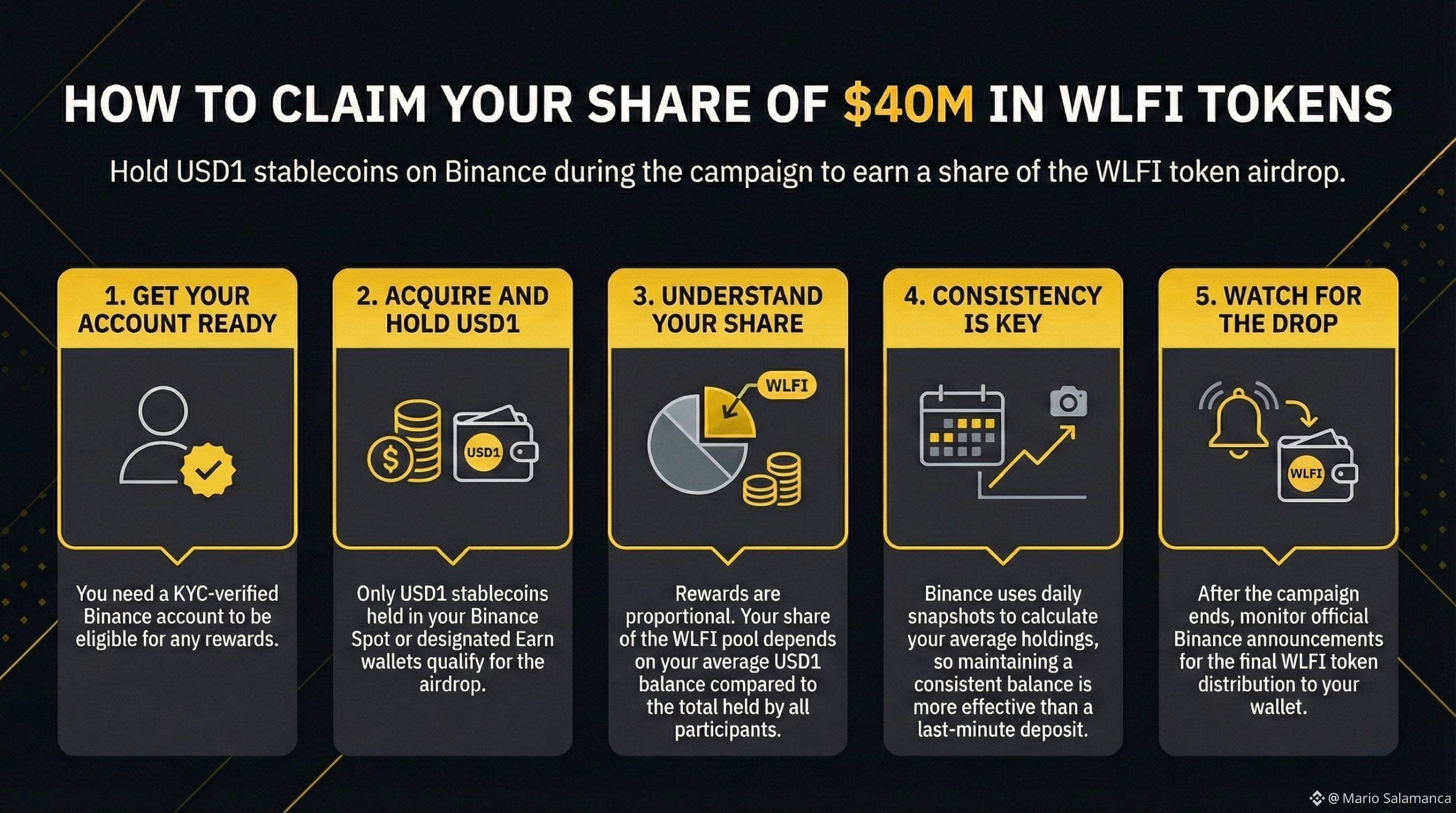 The USD1 / WLFI campaign is a holding-based airdrop organized by Binance. Users who hold eligible amounts of the USD1 stablecoin on Binance during the campaign period may qualify to receive WLFI tokens, distributed proportionally based on their average holdings.