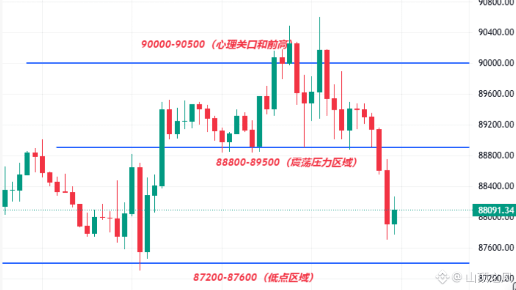 关键点位:上方阻力区间位于88800-89500美元,若突破可上看90000及前高90587美元;下方支撑重点关注87500-88000美元区域。