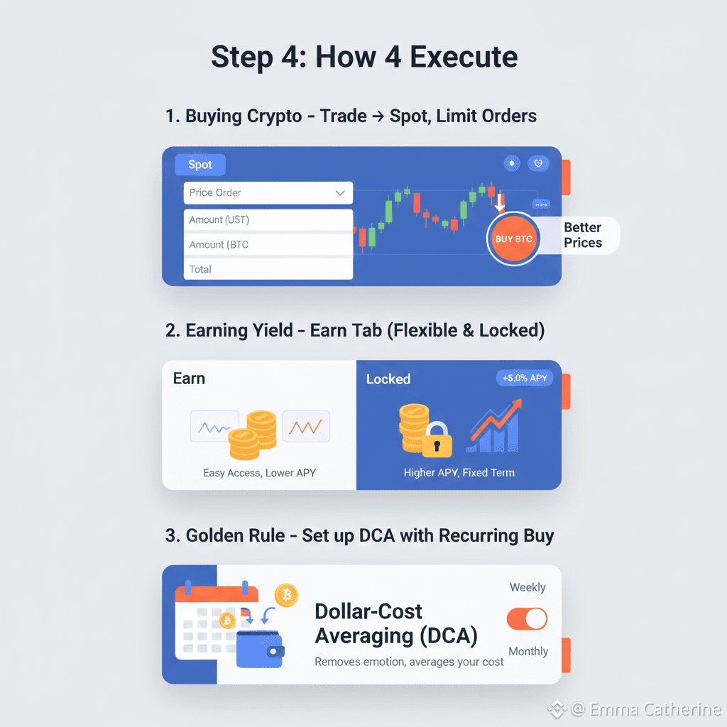 Buying Crypto: Go to Trade → Spot. Use Limit Orders for better prices.