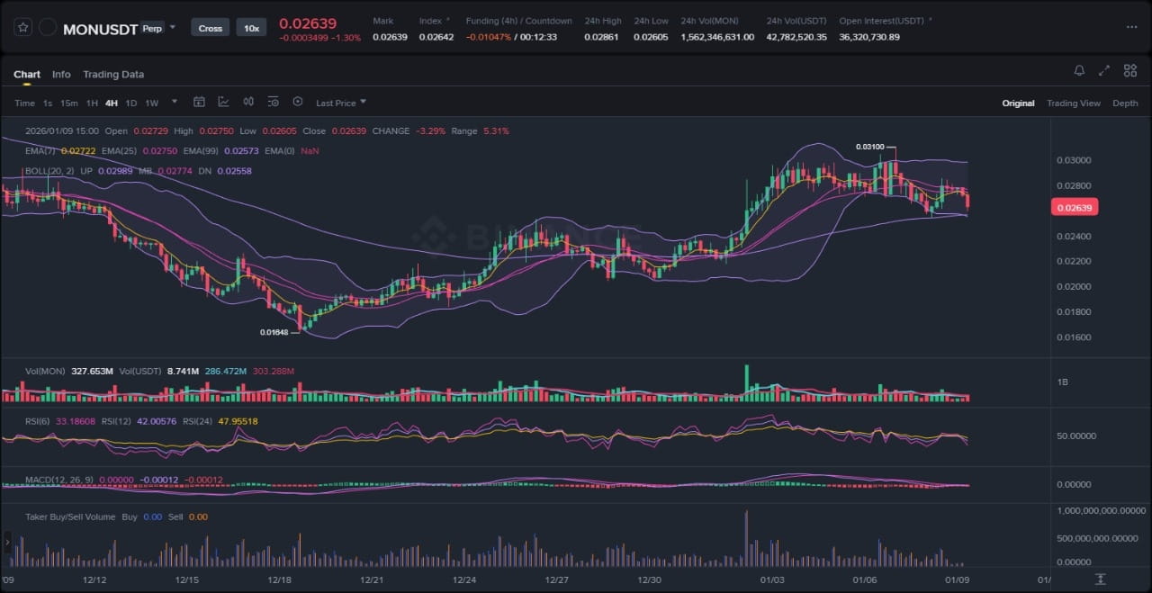 Die Preisstruktur von MON zeigt einen impulsiven Aufwärtstrend, der einen Ausbruch aus einem mehrwöchigen Konsolidierungsbereich versucht, gekennzeichnet durch eine Reihe höherer Tiefs seit Mitte Dezember 2025. Bei der Betrachtung des Charts umfassen die Schlüsselfaktoren eine scharfe Ablehnung am lokalen Swing-Tief von $0.021 am 30. Dezember, gefolgt von einer Volatilitätserweiterung, die die Preise im letzten Handel auf $0.027 trieb. Der 7-Perioden-EMA neigt sich nach oben und überschreitet sowohl den 25-Perioden- als auch den 99-Perioden-EMA, was eine bullish Ausrichtung bestätigt und das Ende einer früheren Verteilungsphase signalisiert. Die Bollinger-Bänder haben sich erheblich erweitert, wobei der Preis das obere Band umarmt, was auf anhaltenden Kaufdruck hindeutet und Potenzial für weitere Erweiterungen zeigt, wenn das Volumen anhält. Auf dem aktuellen Niveau von etwa $0.026 deutet die Struktur auf einen intakten Aufwärtstrend hin, jedoch nicht ohne Risiken einer Mittelwert-Rückkehr, falls überkaufte Bedingungen auftreten.