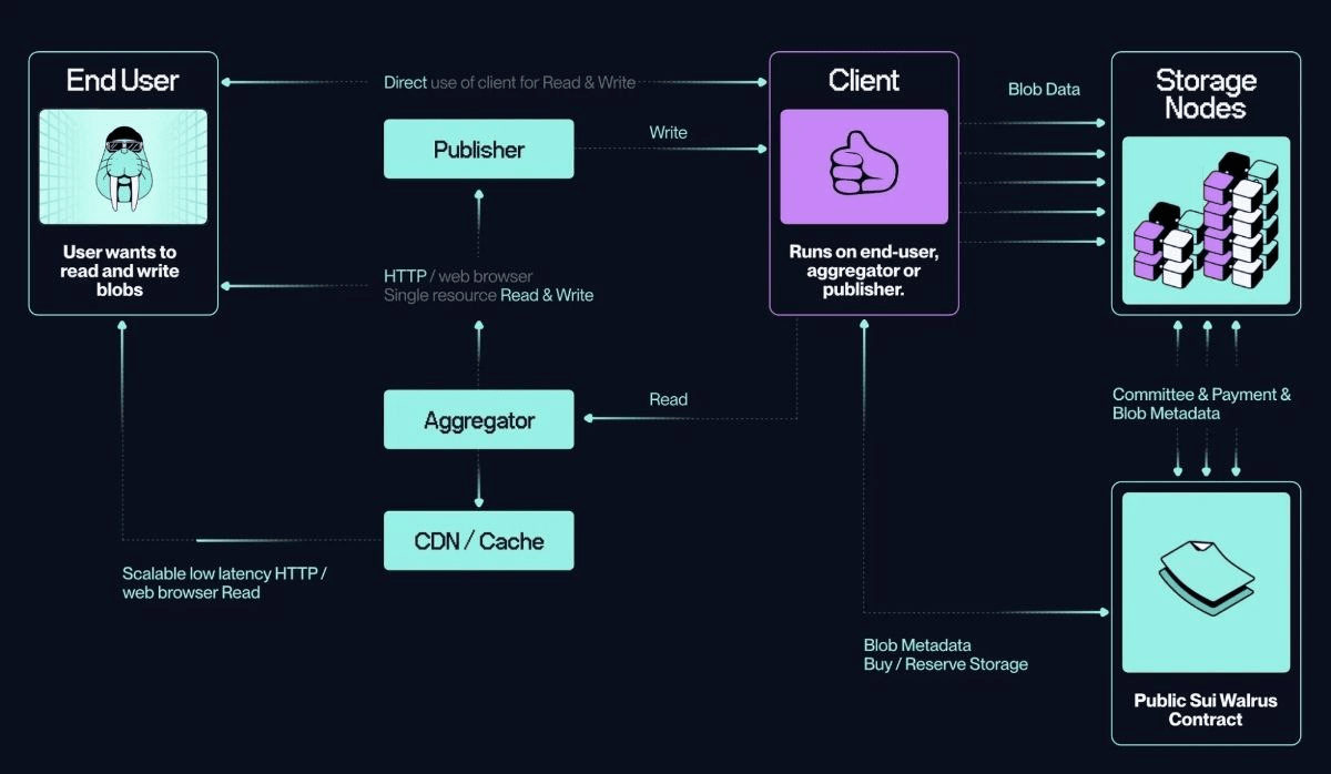 Öffentliche Walrus-Knoten auf Sui funktionieren als Steuerungsebene: Installieren von Metadaten und Verfügbarkeitsnachweisen auf der Kette.