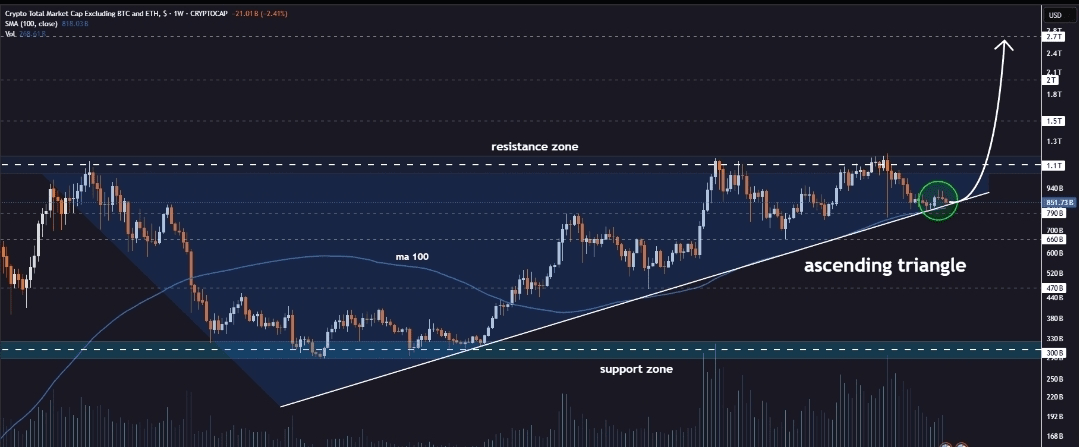 Die gesamte Krypto-Marktkapitalisierung handelt nahe der unteren Grenze eines aufsteigenden Dreiecksmusters im wöchentlichen Zeitrahmen 🔍 $XNY